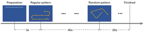 To assess participants’ visual attention and working memory, we designed a structured gaze-tracking task based on their eye movement patterns. This design was inspired by the King–Devick (KD) test [], which has been shown to differentiate saccadic eye movements in individuals with AD from HC participants []. Participants were instructed to follow a red dot as it moved across a screen for 60 s, with position updates every 0.5 s. The task was divided into three phases: a 3-second preparation phase, where the dot remained centered on the screen; a 40-second regular phase, with predictable motion to assess sustained attention; and a 20-second random phase, where the dot moved unpredictably to evaluate flexibility in gaze control.