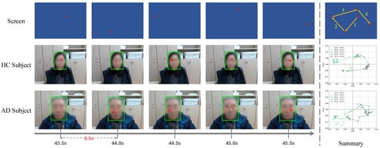 Figure 5 outlines this procedure. Figure 6 illustrates a 2.5-second interval (43.5–46.0 s) during the random phase. The red dot’s movement over time is visualized through sequential frames and summarized in a single image. The figure compares gaze behaviors between an HC participant and an AD participant using both the face detection and gaze detection models (see Section 3.1). Green bounding boxes mark the detected faces, and red arrows indicate gaze directions. During the 2.5-second interval (75 samples at 30 fps), the HC participant consistently tracks the moving dot, whereas the AD participant exhibits scattered and unstable gaze trajectories, reflecting impaired visual attention and motor control.