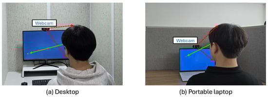 Both datasets were recorded using a Logitech C920s PRO HD webcam at 30 frames per second (fps). The resolution was down-sampled to 640 × 480 pixels for storage efficiency. The in-distribution and out-of-distribution data were collected using a 612.00 mm × 344.25 mm desktop and a 357 mm × 224 mm portable laptop, respectively. Figure 7 illustrates the recording conditions.