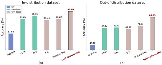 As shown in Figure 8a, the dual-pathway CNN attains 91.09% accuracy on the in-distribution dataset, significantly outperforming all baseline methods. Traditional approaches, such as DTW-SVM (61.62%), struggle to model complex temporal dependencies, while RNN-based models (LSTM: 81.25%, GRU: 85.15%) provide moderate improvements over 1D CNN-based methods (TCN: 79.49%, InceptionTime: 81.22%), likely due to their ability to capture fine-grained temporal variations.