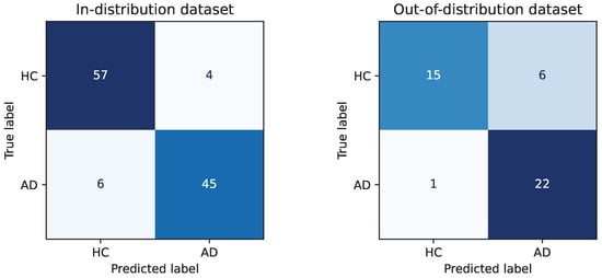 To provide a more detailed understanding of the classification behavior, we further present the confusion matrices of the dual-pathway CNN in Figure 9. On the in-distribution dataset, the model shows balanced and high classification performance, correctly identifying HC and AD participants with few misclassifications (HC: 57/61, AD: 45/51). On the out-of-distribution dataset, while a slight decrease in classification performance is observed due to increased variability, the model still maintains a strong ability to differentiate between classes. Specifically, only 1 AD case is misclassified as HC, demonstrating high sensitivity in detecting AD, which is critical in clinical applications. These results validate that the dual-pathway CNN not only achieves high overall accuracy but also exhibits stable class-wise performance under distributional shifts.