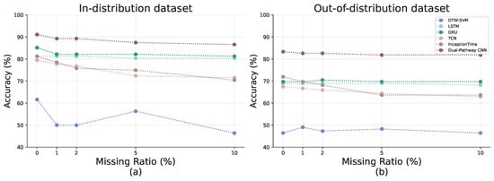 Analysis of robustness against missing data for (a) in-distribution and (b) out-of-distribution datasets. The x-axis in each plot indicates the data drop ratio. The y-axis is the corresponding classification accuracy.