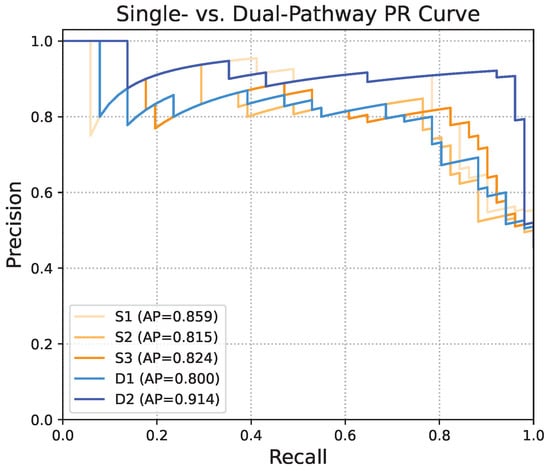 Comparison of precision–recall (PR) curves between single-pathway and dual-pathway structures. Average precision (AP) summarizes the area under the PR curve.