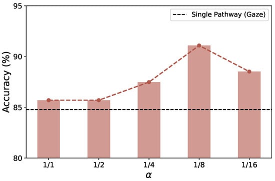 Channel Capacity of Sub-Pathway. Finally, we vary the channel capacity of the sub-pathway (head pose) by modifying the ratio with respect to the main pathway (Figure 12). The results indicate that a channel ratio of 1/8 achieves the highest accuracy (91.09%), confirming that a lightweight sub-pathway effectively enhances the feature representation of the main pathway. Moreover, reducing below 1/2 consistently improves overall accuracy, whereas setting to 1/2 or 1 produces no further gain, suggesting that head-pose information is more complementary than dominant in AD detection.