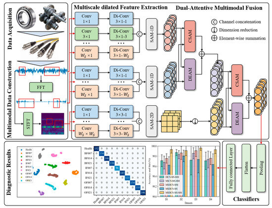 To address the abovementioned issues, the dual-attentive multimodal fusion method combining a multiscale dilated CNN (DAMFM-MD) is introduced for multimodal fault diagnosis, featuring two core modules: a three-branch multiscale dilated CNN (MDCN) and a dual-attentive multimodal fusion module (DAMFM). Firstly, multimodal data are constructed using time signals, the FFT-based frequency spectrum, and STFT-based time–frequency images, delivering complementary data modalities that enable comprehensive feature representation learning. Secondly, the MDCN is designed for multimodal data, and attention mechanisms are used to fuse multiscale information to effectively solve the nonstationary problem. The 1DCNN is employed to filter the multiscale time-domain and frequency-domain features, while a 2DCNN is adopted to capture time–frequency domain information. Finally, a two-stage modality-wise fusion is used to dynamically conduct the complementary sequential fusion of information in the three feature maps. The commonality selection attention mechanism (CSAM) and differentiation enhance attention mechanism (DEAM) emphasize the intrinsic commonality and difference features between modalities, respectively. Sufficient experiments are conducted on both gearbox and bearing fault datasets to comparatively evaluate the DAMFM-MD against state-of-the-art methods. Comparison experiments with popular deep learning methods and single-modal methods on four sub-datasets demonstrate the higher fault classification accuracy of the DAMFM-MD, with the best reaching 99.98%. Additionally, the effect of the key components is investigated, and the results validate that the DAMFM-MD can handle multimodal data efficiently under varying working conditions.