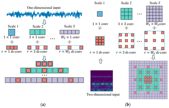 The structure of a multiscale dilated CNN; (a) 1D structure; (b) 2D structure.