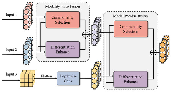 where denotes the feature maps of the ith modality output from the ith branch through the corresponding calculation . It is worth noting that is divided into two categories, and , with the same logical but different dimensional structures, respectively, due to the identities of different inputs. The subsequent descriptions mainly focus on the logical implementation, without distinguishing the dimensional structures of the 1D and 2D processes.