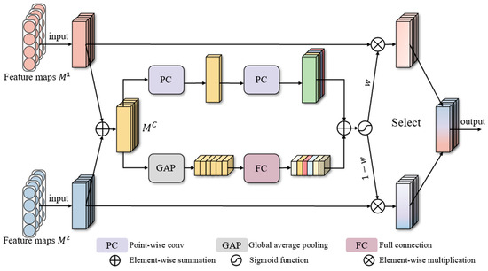 where denotes the convolution operation. Is the kernel weight of the sth scale, while represents the dilated kernel with different . And is the bias of each process. is the nonlinear activation function. Then, each scale feature map of the ith modality is stacked to obtain , which comprises K feature channels due to the use of kernels per scale. However, a simple concatenation scheme easily neglects valuable information; thus, a more sophisticated approach is required to consider the importance of scales.
