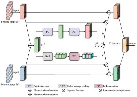 The DEAM aims to emphasize the hidden informative features through specialization characteristics between the two modalities, as shown in Figure 6. Firstly, parameter subtraction is employed to remove common features and retain differences, and then dual-branch weight-computing operations are employed to obtain global representations from multiple views. Next, weight vectors generated via sigmoid activation perform the channel-wise scaling of input representations, resulting in the difference-selected feature maps. Finally, residual learning is introduced in the block to effectively combine the processed features with the initial ones, outputting differentially enhanced feature maps . This approach prevents the loss of informative features when utilizing weighted features directly. Therefore, the block is improved significantly with the residual enhancement. The calculation procedure can be concisely expressed as follows:
