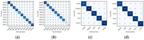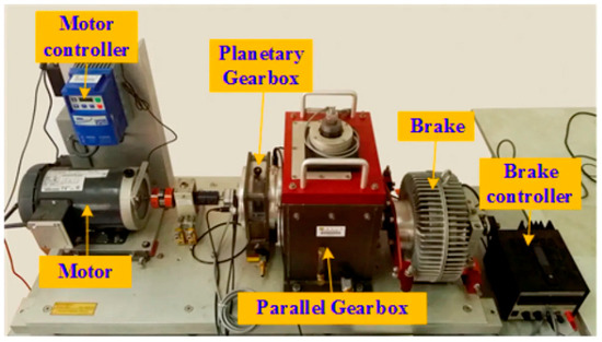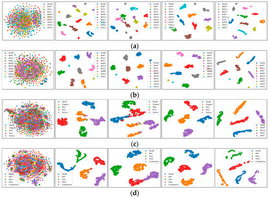The SEU case utilized two sub-datasets, gearbox data and bearing data, collected from the drivetrain dynamic simulator (DDS), as shown in Figure 8. The sampling process involved two operating conditions with different speed–load configurations, specifically 20 HZ-0V and 30 HZ-2V [57]. Gearboxes (D3) and bearings (D4) each had five fault categories, consisting of four fault states and one health state. Table 1 shows the specific categories. Consequently, the SEU dataset enables a five-class fault diagnosis classification task. Each fault category in both sub-datasets comprised 1022 samples, resulting in a total of 5110 samples. Take the gearbox dataset as an example, the sampling process involved eight cooperative sensors, including motor vibration, motor torque, and vibration in three directions of the planetary gearbox and parallel gearbox, respectively. In addition, the 2048 data points collected from the eight sensors were combined in parallel to form a multisensor representation for each sample.
