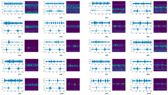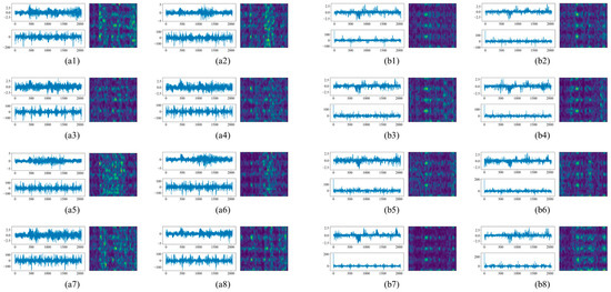 To construct the multimodal data, FFT and STFT were used to convert various types of original signals to frequency spectrograms and time–frequency images, respectively. The resulting constructed data correspond with and are reflective of the original samples. For FFT in each of these experiments, the size of the data points obtained is aligned with the original time-domain signal. For STFT, we set the window length to 64; thus, 1D signals were transformed to length–width sizes of 33 × 33 and 33 × 65 for different datasets. The original signals were then combined in parallel with the time–frequency images to create multimodal data. To illustrate this process, Figure 9 and Figure 10 demonstrate the one-to-one correspondence of time-domain, frequency-domain, and time–frequency domain data under four datasets.
