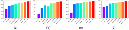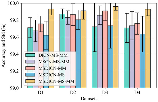 Figure 18 demonstrates that the optimal scale–channel settings of the proposed DAMFM-MD under four datasets are 5-32, 3-32, 6-64, and 5-64, respectively. Firstly, when more scales are introduced, the metrics of the method progressively grow. For example, Figure 17a demonstrates that the model’s mean accuracy progressively improves when increasing the number of scales from two to five, especially in channel 32, reaching a peak of 99.96%. This indicates that the application of convolutional kernels with different sizes facilitates multiscale representation learning and reduces nonstationarity-induced artifacts, and a higher scale count leads to significant improvement in the feature extraction ability and stability of the DAMFM-MD. Secondly, the results in all four datasets turned out to be superior as the number of channels increased, which means that a more optimal number of channels stimulates a fuller multimodal information fusion. However, as the variables for both scales and channels increase to a certain level, a downward trend in accuracy is observed. The accuracy of the method is 99.72% at a 6-scale with a 64-channel in dataset D1, which is below that of the 5-scale with a 64-channel, and the 6-scale with a 32-channel, possibly due to the overfitting phenomenon caused by increased model complexity.