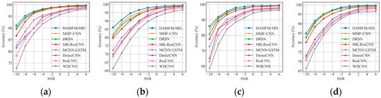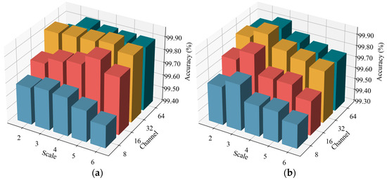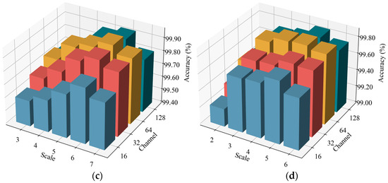 Since the input data contain nonstationary characteristics, the DAMFM-MD adopts multiscale convolutional kernels to achieve optimal feature extraction. Moreover, the feature output of each modality affects the complementary fusion. To evaluate the impact of the model structure, specifically, the number of scales and output feature channels, on fault classification performance, the experiments compare different parameter configurations across four datasets, as visualized in Figure 18a–d. The proposed method is evaluated with scale numbers ranging from two to six, while the numbers of the output channels are set to 8, 16, 32, and 64, respectively.
