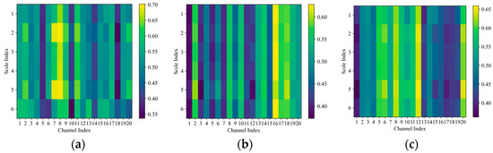 As shown in Figure 16, the multiscale dilated convolution of each scale provides discriminative information. Take Figure 16a as an instance, the activated weight of the eighth channel in the first to fifth samples is around 0.70, which is higher than that of other channels. The weights of useless channels like the 5th, 10th, and 18th channel are less than 0.40. In addition, the attention mechanism incentivizes each channel features to a similar degree.