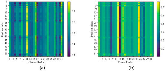 Moreover, multimodal data contain fault information from operating processes but are represented differently; thus, MCA is developed for multimodal fusion, comprising the CSAM and DEAM. To better evaluate the effectiveness of attentive fusion that comprehensively considers both channel and positional features, Figure 17 illustrates the activation heat map for a sample in the D1 dataset, where the n-p value is the weight of the pth position on the nth channel. Since the selection on the commonality of the two modalities is complementary, namely, the weights add up to 1, only the weights of the first feature maps are shown.