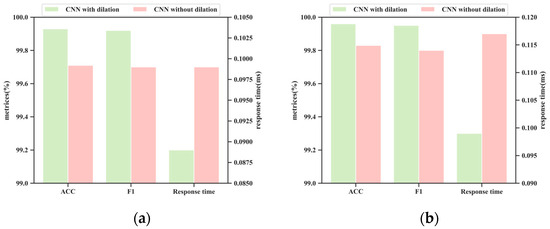 To further validate the effectiveness of dilated convolution operations in fault diagnosis tasks, we have additionally organized a comparative experiment using dilated convolution and a CNN without dilation. The accuracy, F-score, and response time of different methods under datasets D1 and D3 are shown in Figure 20.