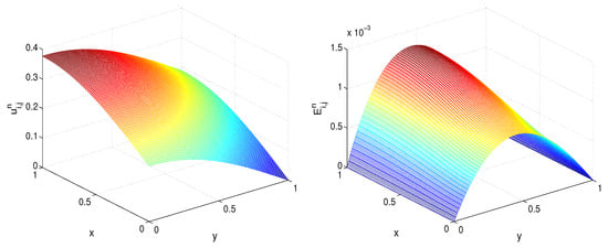 Once the solution , is obtained, we solve the direct problem in Equations (1)–(6) using a standard second-order in space finite difference scheme on uniform spatial meshes with step sizes k and h and with I and J as the number of grid nodes in the x and y directions, respectively. The temporal mesh is .