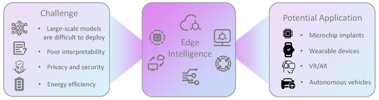 All these edge intelligence techniques aim to streamline artificial intelligence models, making them smaller and faster. Subsequently, these optimized models can be deployed on edge devices to support large-scale applications. This approach significantly enhances the practicality and accessibility of advanced AI capabilities in resource-constrained environments, facilitating real-time processing and decision-making at the edge of the network. These challenges and the potential applications of edge intelligence are summarized in Figure 1.