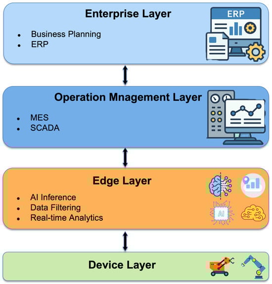 To provide a systematic understanding of the integration of edge intelligence within industrial environments, Figure 2 illustrates a typical layered architecture of manufacturing operations systems. This hierarchical structure comprises four primary layers, each performing distinct functions in data processing, decision-making, and execution.