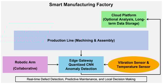 Figure 3 depicts an Industry 4.0-enabled production line equipped with edge gateways, collaborative robots, and various sensors (e.g., vibration and temperature sensors). Edge intelligence models, such as quantized convolutional neural networks (CNNs), are deployed on local edge gateways to perform real-time defect detection, predictive maintenance, and anomaly analysis. Sensor data and production images are processed locally, while optional data can be uploaded to the cloud for long-term storage and advanced analytics. This architecture enhances operational efficiency, improves product quality, and reduces latency and privacy risks associated with cloud-only processing.