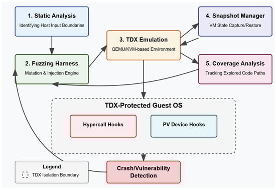 However, fuzzing a TDX guest poses unique challenges. The TDX design establishes a new trust boundary. The guest OS is not fully visible or accessible to the hypervisor, making traditional hypervisor-based instrumentation difficult. The guest communicates with the outside world via limited channels (special CPU instructions and shared memory buffers), and the TDX’s goal is to minimize these channels. Additionally, a TDX guest’s code (especially the OS kernel) is adapted to run in an isolated mode with many features disabled or paravirtualized for security []. This constrained environment complicates the injection of test inputs and the observation of guest behavior. Furthermore, hardware support for the TDX is relatively new and not widely available, so developing a fuzzing framework may require an emulated or simulated TDX environment to run on commodity hardware []. These considerations define a new research problem: How can we design and implement an effective fuzzing framework for Intel TDX guests that overcomes the isolation barriers to reveal security vulnerabilities, and how well does such a framework perform in theory and practice?