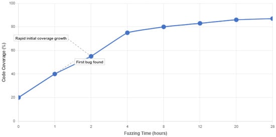 As shown, the fuzzer rapidly achieves an initial coverage plateau, followed by incremental improvements in exploring rare or error-handling code paths. Coverage eventually approached 90%, reflecting diminishing returns typically seen in extended fuzzing sessions.