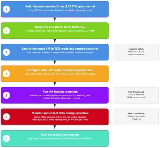 Next, we address the challenge of running the TDX-like guests on standard hardware. At the time of our work, official TDX-capable CPUs were not broadly available, so we created a software emulator for TDX functionalities in a QEMU/KVM [,]. We emphasize that, while this emulator closely models the TDX architectural constraints, real TDX hardware may have subtle or additional behaviors that are not fully captured by the software emulation. This minimal TDX module emulator intercepts the TDX-specific operations—for instance, creating or shutting down trust domains—and mimics how the TDX hardware enforces isolation []. When the guest kernel performs an instruction that the TDX typically forbids (e.g., certain MSRs), our emulator injects a virtualization exception (#VE). This approach is not secure in the production sense; the host can still view guest memory. However, it captures the TDX semantics closely enough for fuzz testing, letting us observe coverage and intercept crashes at the hypervisor level [].