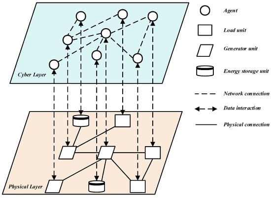 A cyber–physical system (CPS) is an advanced engineering system that integrates computation, communication, and control. The CPS approach has been widely adopted in power systems. Figure 1 illustrates the cyber–physical system model of a VPP. In this model, power generation devices, energy storage devices, and loads constitute the physical layer of the CPS. Each device is equipped with an agent; the communication network between these agents forms the information layer of the CPS. This paper introduces graph theory to describe the information–physical system model of the VPP. The topology of the VPP can be represented by a binary group , where denotes a set of nodes, each representing an agent, and denotes the set of edges. The adjacency matrix is defined such that if node i and node j communicate with each other and otherwise.