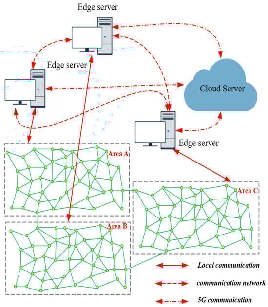 As the scale of actual power systems increases, distributed framework algorithms struggle to accommodate complex network topologies [25]. To address this challenge, this paper introduces the concept of a cloud–edge–end cooperative control framework. First, the power grid is divided into multiple regions based on the network topology. Each region is then equipped with an edge server for control. All edge servers are connected to a cloud server, which utilizes its computational resources to calculate the power output required from each region. The cloud server then sends the computation results to each edge server, which further enables each agent to reach a consensus through a distributed optimization algorithm. Consequently, the distributed optimization algorithm designed under the cloud–edge–end framework is better able to meet the demands of modern power systems. The contributions of this paper are as follows: