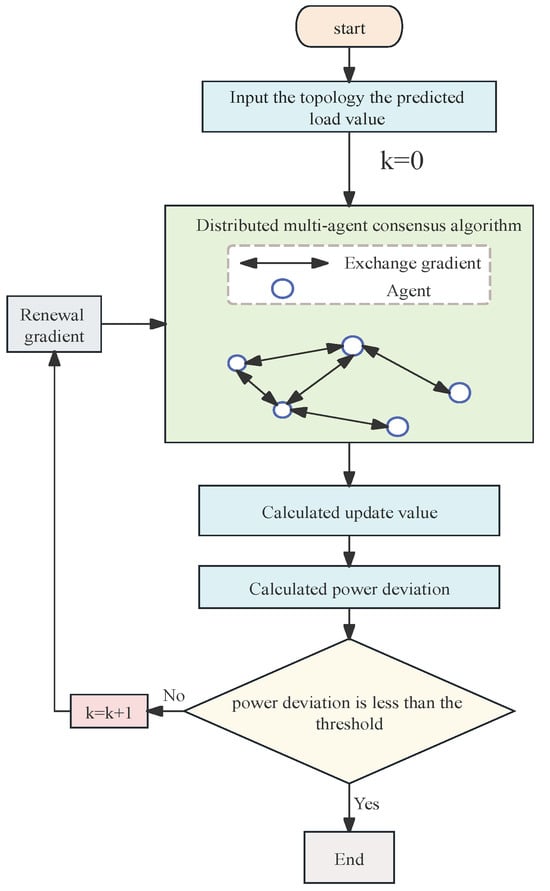 In the cloud–edge–end cooperative control framework, the power generation in each region is first solved at the level of the cloud. Next, a distributed consensus algorithm is applied to each region. Figure 3 delineates the convergence protocol governing collaborative decision-making among distributed autonomous entities and provides a systematic presentation of the specific operational stages.