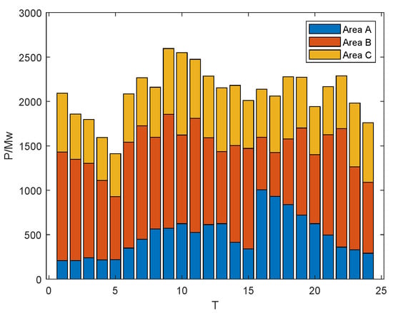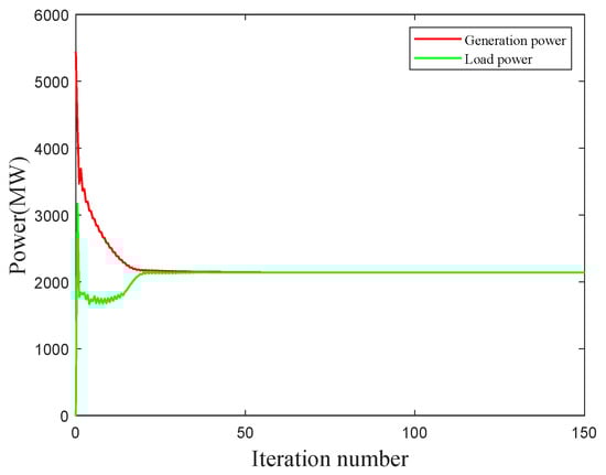 The solution for this three-area system involves two steps. In the first step, the cloud platform collects information from all regions and determines the optimal generation values for regions A, B, and C. Figure 4 shows the power generation required at each time for the three areas based on 24-h load forecast values. In the second step, the results from the cloud platform are transmitted to the edge server in each region, which performs the optimal power allocation. We select as a representative to verify the algorithm’s feasibility. As shown in Figure 5, after iterating the consensus algorithm, the error between the supply and demand measurements converges to zero, indicating that the proposed algorithm satisfies the equation constraints.