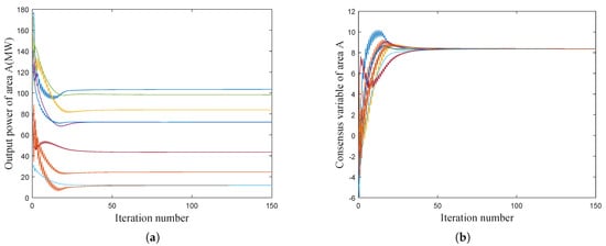 Inside convergence of area A of algorithm (13): (a) output power of all generators consensus variable and (b) consensus variable.