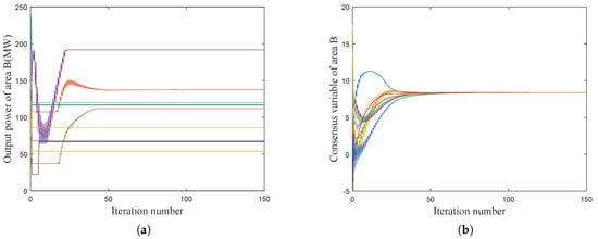 Inside convergence of area B of algorithm (13): (a) output power of all generators and (b) consensus variable.