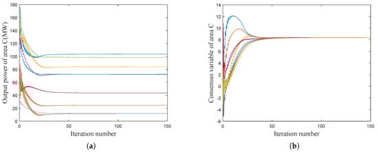 Inside convergence of area C of algorithm (13): (a) output power of all generators and (b) consensus variable.