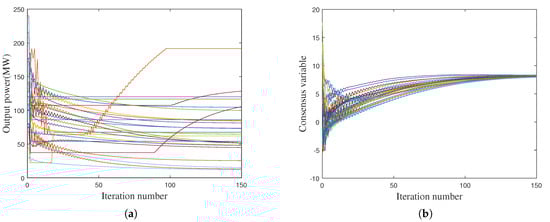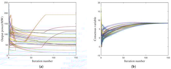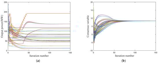 Performance of the algorithm in (13) without the cloud–edge–end framework: (a) output power of all generators and (b) consensus variable.