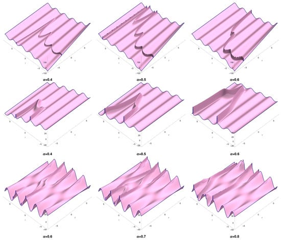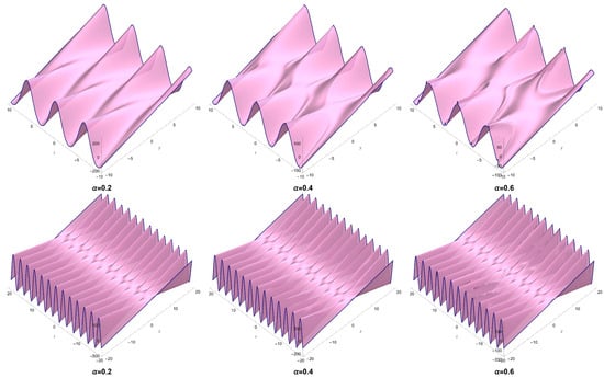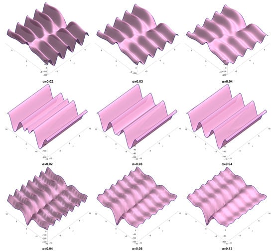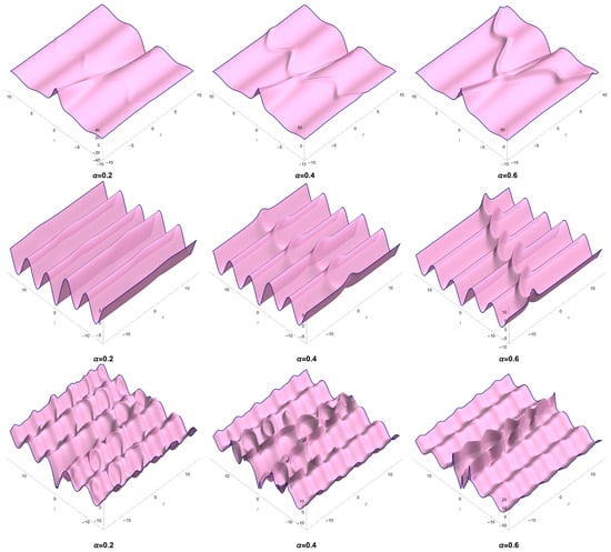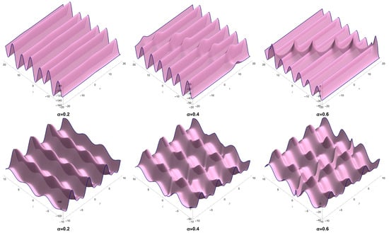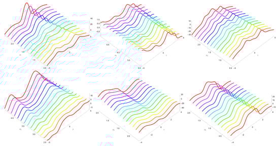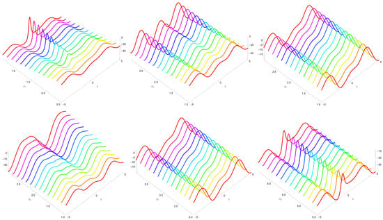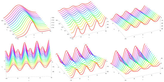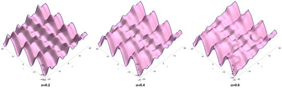 Several dynamics of solution (52) for some values of across different directions are displayed in Figure 5. In this plot, we consider Equation (54) in Equation (13) along with keeping the other constants.