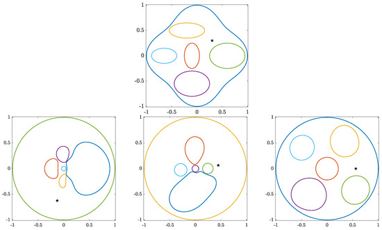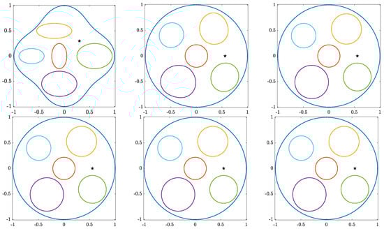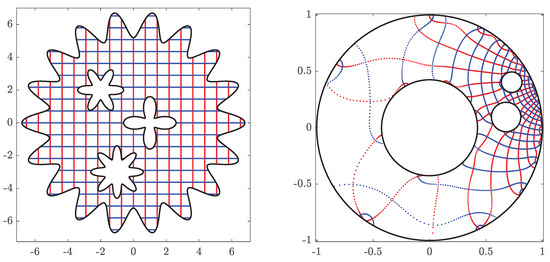 An important canonical multiply connected domain that is not a slit domain is the circular domain, i.e., a domain all of whose boundary components are circles (see [3,11,12]). Circular domains are ideal for using Fourier series and FFT [13,14]. Further, analytic formulas exist for several applied problems in circular domains (see the recent monograph [1] and the references cited therein). See also [15]. Koebe’s iterative method [3] is the first numerical method for computing conformal mappings onto circular domains. Several numerical implementations of Koebe’s iterative method have been proposed in the literature; see [12,15,16,17,18,19,20] for details. The fast and accurate method presented in [18,19] is based on a combination of the usage of the boundary integral equation with the generalized Neumann kernel and the fast multipole method (FMM). For numerical methods for computing conformal mappings from circular domains onto multiply connected domains, see [13,21].