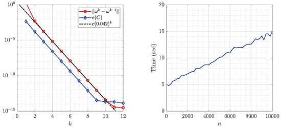 Left: The successive error and the roundness error for Example 1 obtained with . Right: Run time in seconds as a function of n required by the generalized Koebe’s method after 12 iterations for each n.