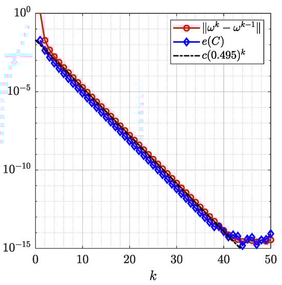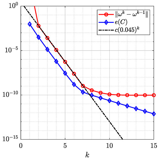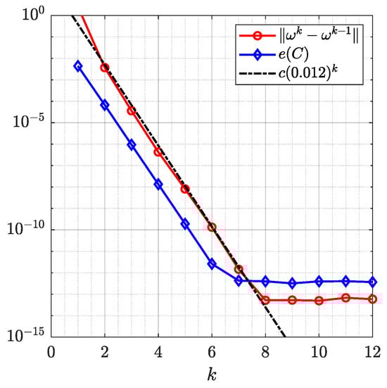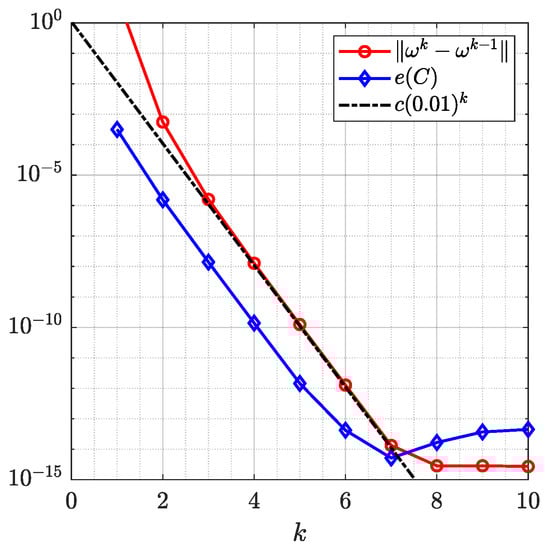 where is a given tolerance and is the maximum number of iterations allowed. In the numerical examples presented below, we choose and . If the condition (17) is not satisfied, we set