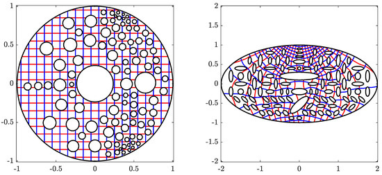for , onto the domain Ω obtained by removing two disks from a circular ring, where . The obtained numerical results are presented in Figure 7, Figure 8 and Figure 9.
