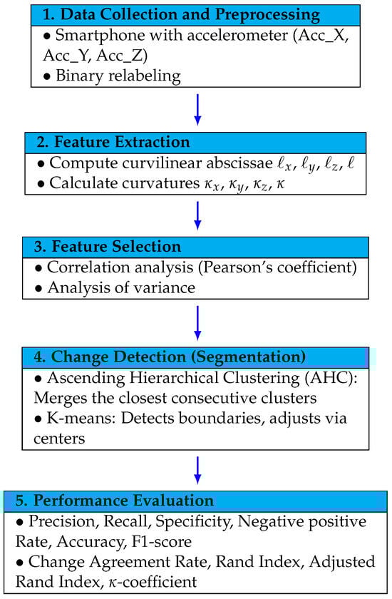 The proposed methodology consists of five steps: (1) Collection and preprocessing of accelerometer data, where smartphone sensors record vibrations along road segments. (2) Feature extraction is performed using numerical integration and differentiation techniques to calculate curvilinear abscissas and curvatures. (3) Feature selection, where correlation and variance analyses are used to retain the most discriminative attributes. (4) Change detection is carried out using adapted versions of Ascending Hierarchical Clustering (AHC) and K-means, tailored to the sequential nature of the data. (5) Performance evaluation of the resulting segmentation using both classical metrics (e.g., Precision, Recall, F1-score) and additional measures such as the Adjusted Rand Index and the Change Agreement Rate. The overall methodological framework adopted in this study is summarized in the workflow presented in Figure 1. The proposed methodology is generalizable and remains applicable regardless of sensor frequency, driving behavior, or environmental conditions.