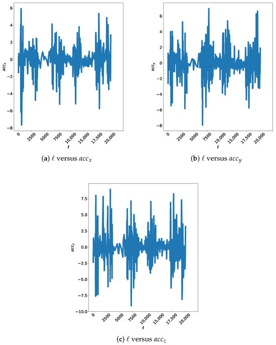 Figure 2 shows the evolution of the three components of the acceleration vector (, , ) as a function of the distance traveled ℓ. This shows changes in driving pace and trajectory. These changes can be explained by the local characteristics of the road, including its quality. Although the shapes of the curves are visually different it is difficult to evaluate the most significant profile.