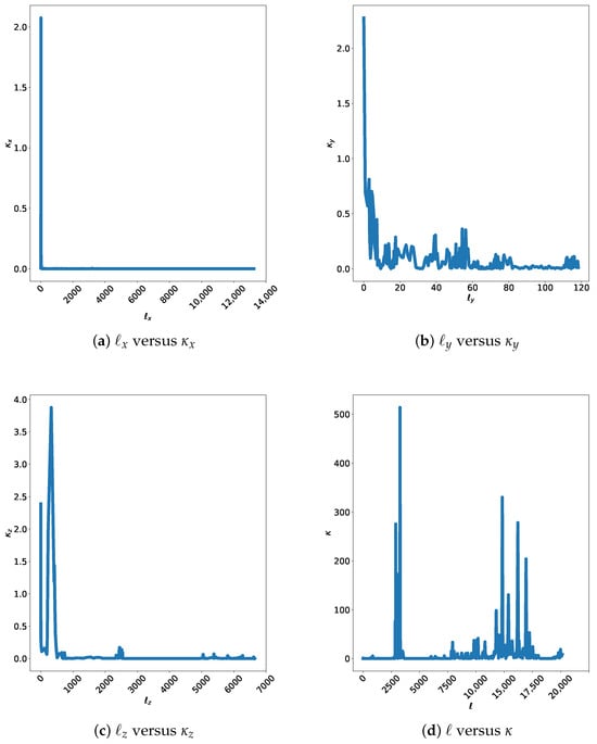 The data is enriched by secondary information calculated on the basis of the first data collected: curvilinear abscissa (ℓs) and curvatures (s). Since only the changes are of interest, the data are relabeled with binary values. In this approach, changes are represented by transitions from 0 to 1 or from 1 to 0, as illustrated in Table 3. The sequence of labels corresponds to the following three classes: , , and . This labeling aligns with the logical framework for change detection described in [15]. The curvilinear abscissas in each direction of the orthonormal basis of Cartesian space, and the associated curvatures, are also added to the data, as shown in Table 4.
