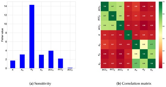 Since Figure 2 and Figure 3 allow hypotheses to be made about the factors that predict the quality of a road, we have proceeded to use the data available from analyses of variance. Similarly, correlation studies were carried out to avoid redundancy of information. Figure 4 shows the Fisher statistics for each potential predictor of road quality and displays a co-relation matrix. It emerges that the most relevant predictor is with a Fisher value of and a p-value of . It is followed by with a Fisher value of and a p-value of . The parameter is very insignificantly relevant with a Fisher value of and a p-value of . The correlation matrix shows correlations in the group of acceleration components and in the group of curves . We also find that curvatures are highly non-linear transformations of acceleration. By combining the analysis of variance and the analysis of correlation, it seems natural to select as a predictor of road quality.