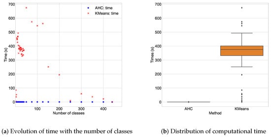Figure 5 shows the experimental execution times for the K-means and AHC algorithms. Naturally, the fewer the classes, the longer the classification procedure. The times of the K-means algorithm largely dominate those of the AHC algorithm. This can be explained by the convergence process of the K-means algorithm, which is exploratory in nature. It was also predictable according to complexities of those algorithms that were polynomial for AHC and exponential for K-means.