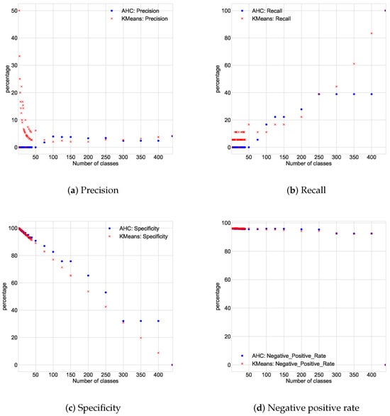 and we apply the Equations (20)–(22) after replacing by . In that case . The aim here is to check if at least the first classes agree with the reference clustering when the number of classes is limited to . A perfect agreement on these first classes would suggest that, by reducing the limitation on the number of classes, we could still have relatively good performance.