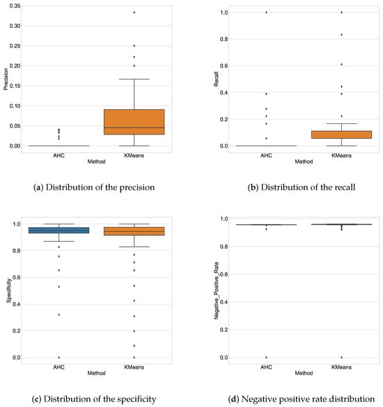 The F1-score is the harmonic mean between the accuracy and the recall rate. It therefore tries to strike a compromise between these two indicators, which must not be zero. Unsurprisingly, the average F1-score of the K-means algorithm () is higher than the average F1-score of the AHC algorithm (). The value of the F1-score is better for a relatively small number of classes.
