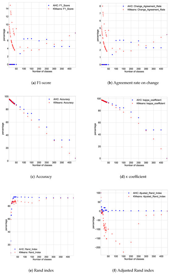 The rate of agreement on change (probability that the prognosis of change or not is endorsed) increases with the number of classes, since more class proposals expose unfounded considerations of change. The average F1-score is for the K-means algorithm and for the AHC algorithm. We note that the F1-score and the rate of agreement on the change have very similar appearances even if the ranges of values are not the same. On the one hand, this confirms the relevance of the F1-score and, on the other, validates the new metric of the rate of agreement with the change, which also offers better interpretation.