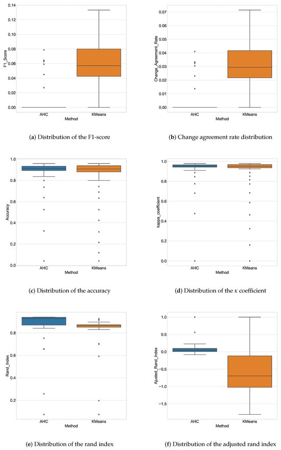 Overall, in terms of the confusion matrix, except for the specificity, the K-means algorithm seems to perform better than the AHC algorithm. We can extend the analysis through more synthetic indicators such as the F1-score, the agreement rate on change, the accuracy, the coefficient, the Rand index and the adjusted Rand index. We use Figure 8 and Figure 9.