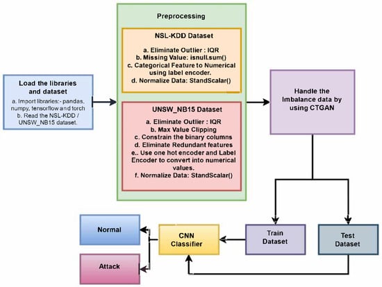 The proposed framework comprises the following steps: pre-processing, data balancing and classification. CNN was chosen for this research as the primary classifier as the classifier effectively learns and generalizes high-dimension structured datasets such as NSL-KDD and UNSW-NB15. CNNs are well-suited for application to structured data for capturing local dependences and spatial hierarchies even if the dataset is not image-based. CNNs automatically extract relevant pattern, thus making the model efficient in learning complex intrusion patterns. The robustness of the intrusion detection system is enhanced by using CNN combined with CTGAN for handling data imbalance, and also improves the performance for minority classes. To balance the records, CTGAN is used and CNN considered for classification. The proposed worked is shown in Figure 1. Within this framework, issues such as pre-processing complexity and class imbalance can be resolved effortlessly. NSL_KDD and UNSW_NB15 datasets are used to train and examine the presented work. The mentioned datasets are freely available on Kaggle.